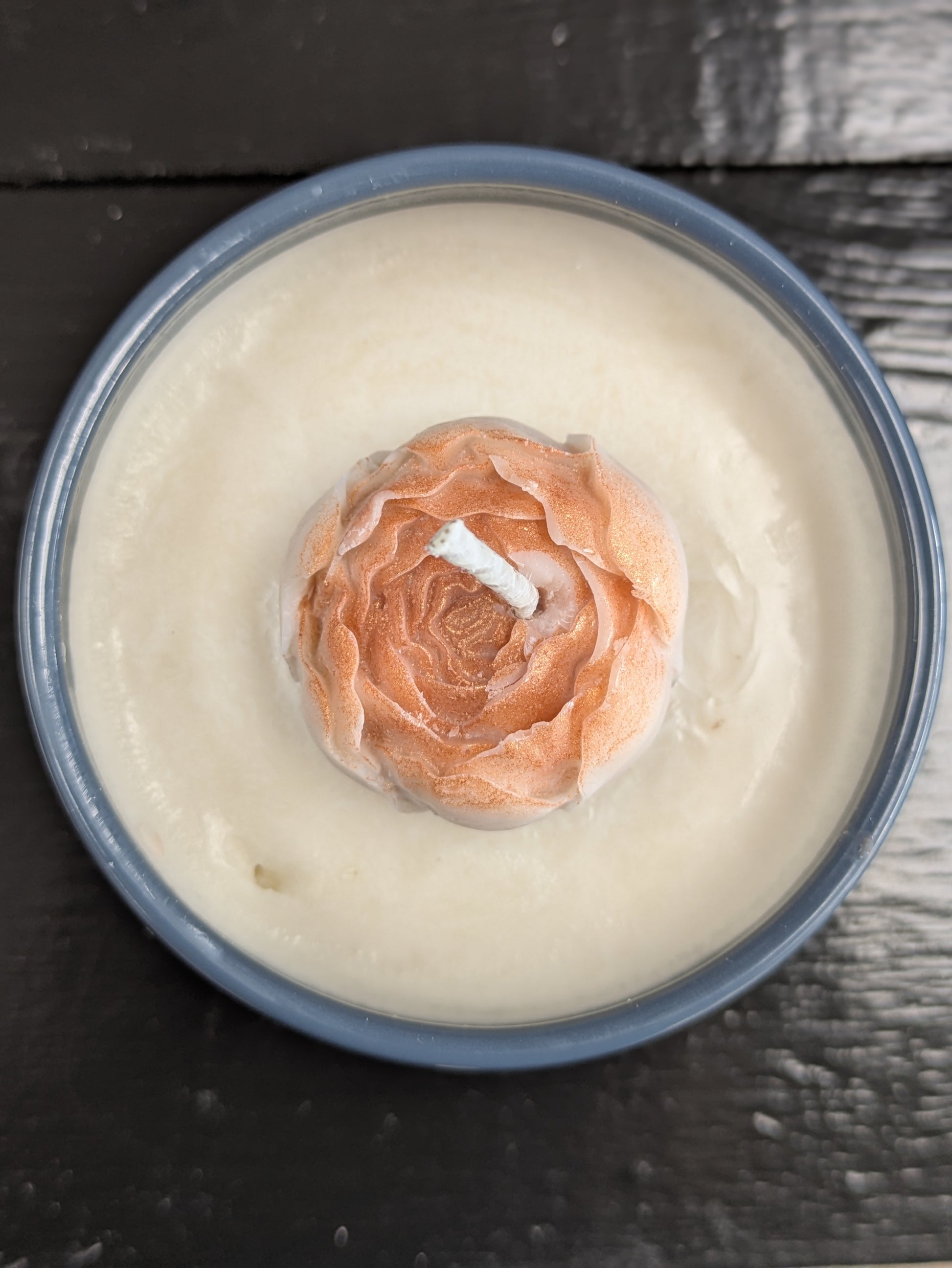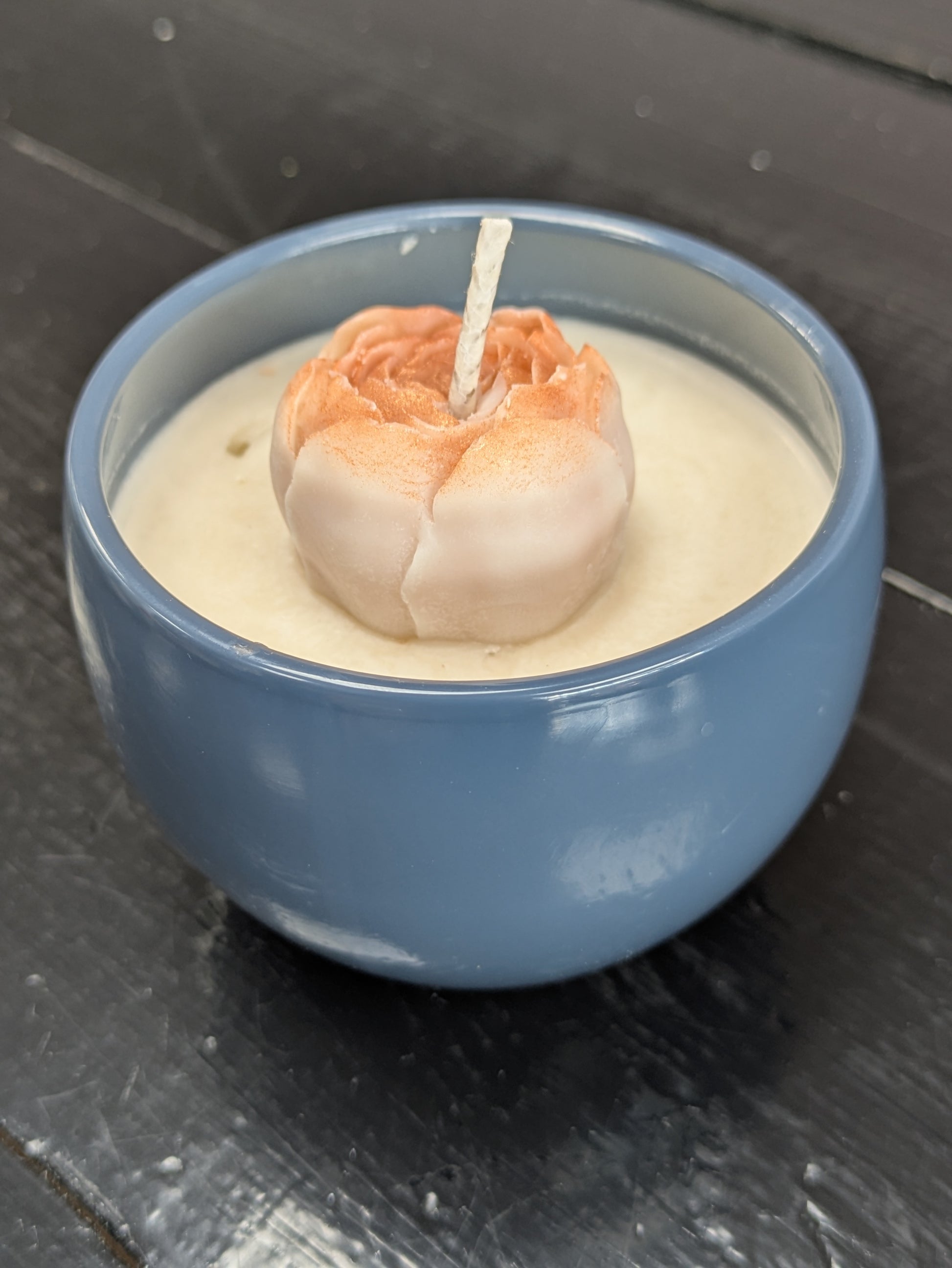 Fireside Tea - this candle will take you to the fireside where you can cozy up with a good book and a cup of sweet and spicy tea. We often brew chai in the farm shop so this seemed like a natural fit for a scent. Notes of cinnamon, chai, vanilla, and a warm fire in a blue vessel with a copper flower topper.